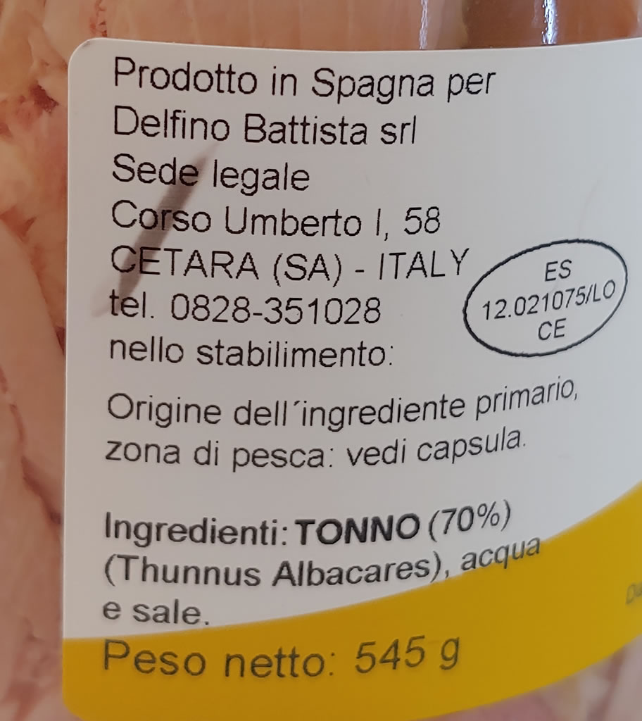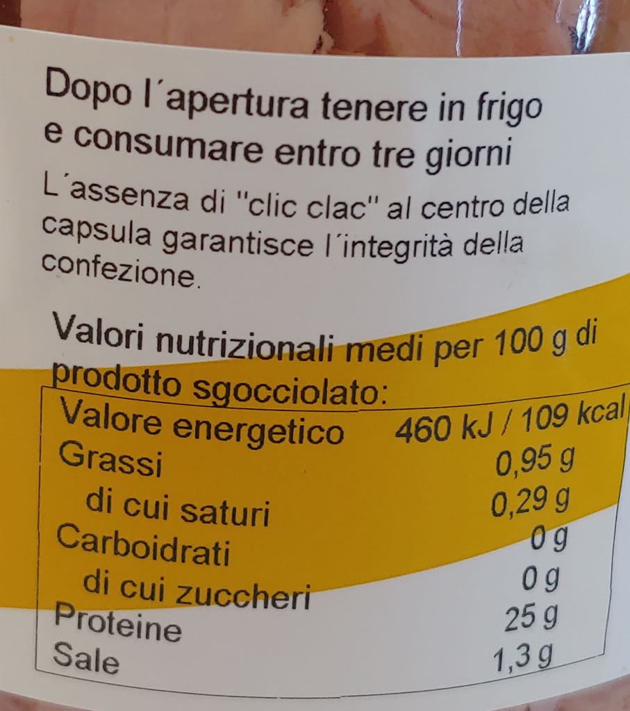 Ingredienti: Tonno (Thunnus albacares), olio d’oliva, sale.