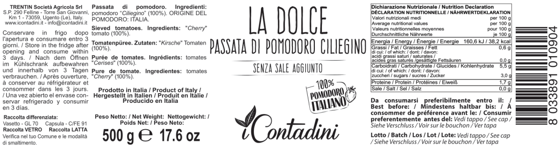 Per La Dolce utilizziamo il pomodoro ciliegino, che si caratterizza per il colore rosso intenso simile al porpora e il gusto dolce. Da questo pomodoro viene fuori una passata dalla consistenza fine e dal sapore delicato, particolarmente dolce. E' la passata che piace proprio a tutti, anche ai bambini, può essere usata nei primi piatti classici, ma anche nei secondi a base di carne.